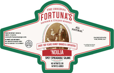 'Nduja is a spicy, spreadable salami popular in Calabria Italy and now made here in the USA by Fortuna's Sausage Co. We use only the best Calabrian hot & sweet peppers direct from Calabria, which gives the true authentic flavor of the "Nduja. This meaty treat is pronounced en-DOO-yah or en-DOO-jah depending who you ask.